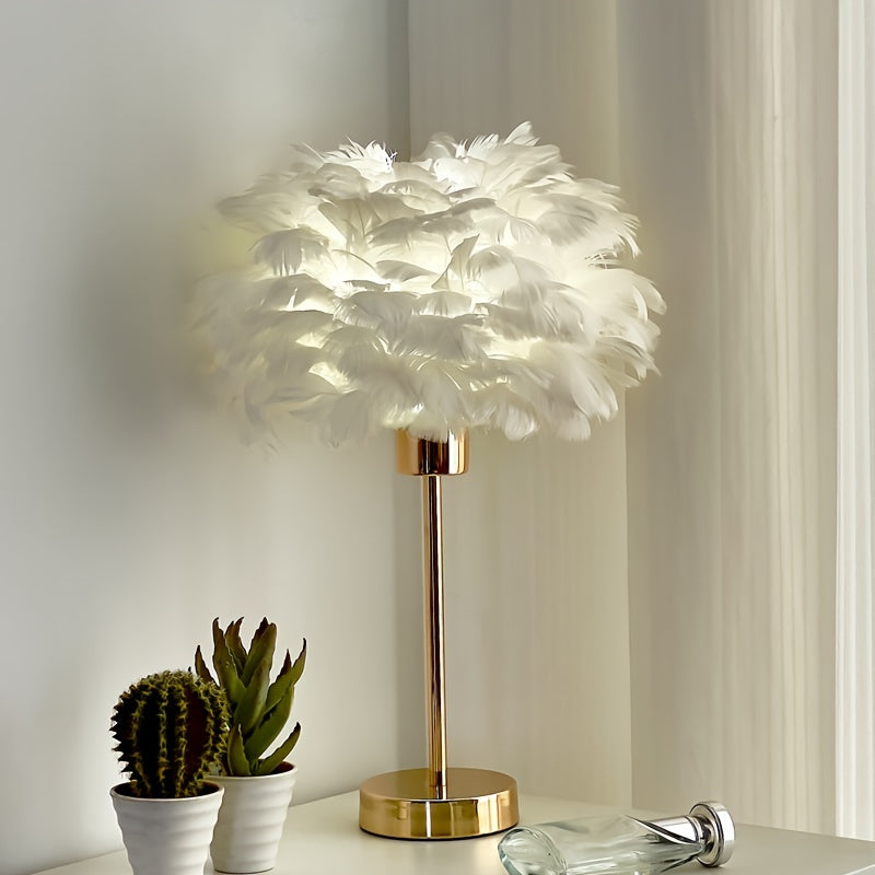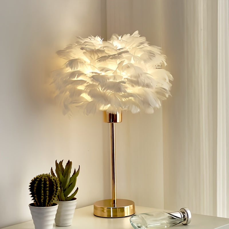בסיס מתכת בציפוי זהב, אהיל בד ארוג, ונוצות לבנות שמפזרות אור רך וחלומי. חיבור USB נמוך-מתח (5V) וכפתור הדלקה נוח. מושלם לאווירה זוגית, סלון, קפה ביתי או כמתנה שמרגישה “וואו”.