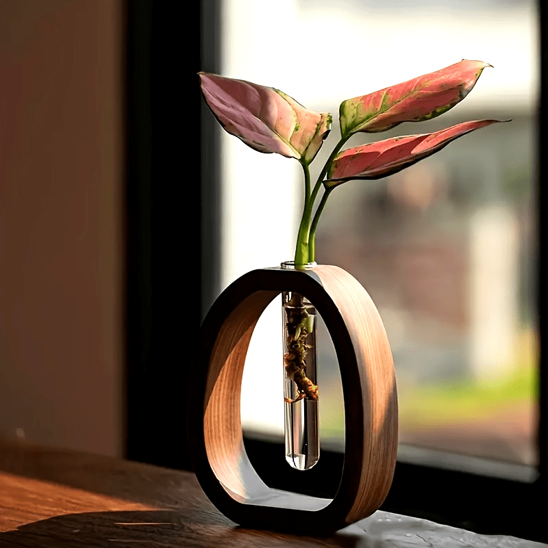 חתיכת עץ אגוז חמימה ומבחנת זכוכית שקופה שמבליטה כל ענף, ייחור או פרח בודד. קטן, אלגנטי, ומשדרג כל פינה בבית או במשרד בלי “לצעוק”.