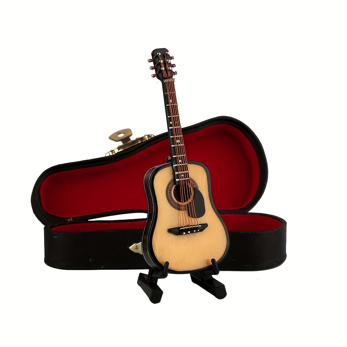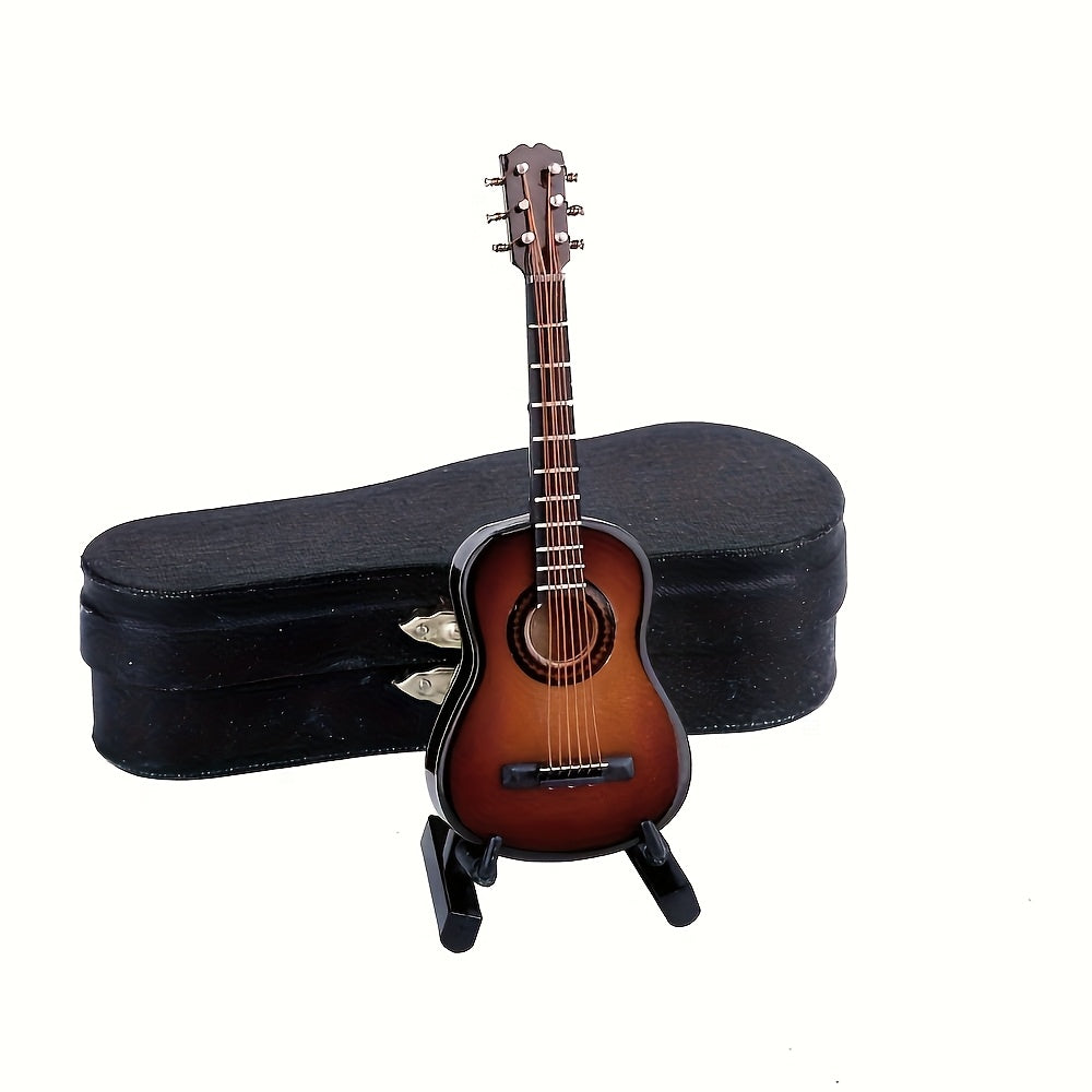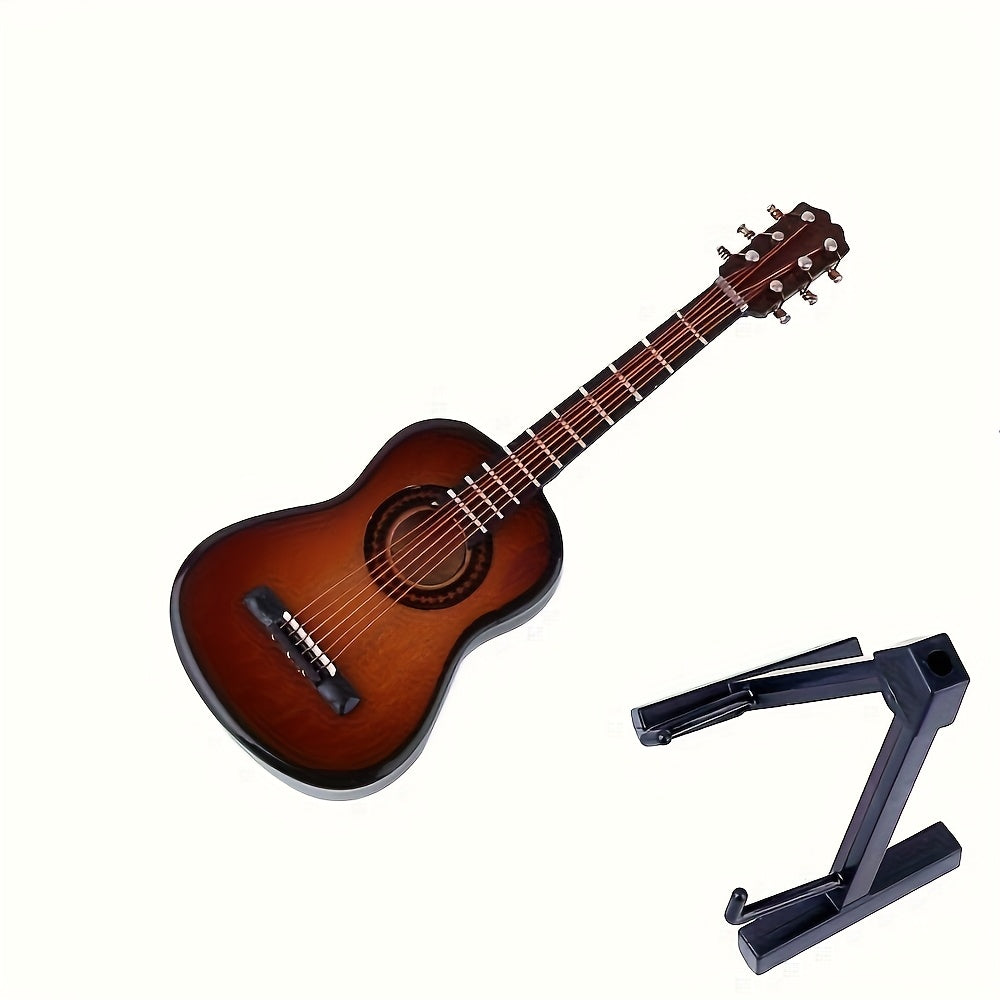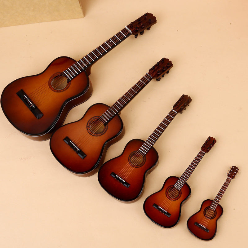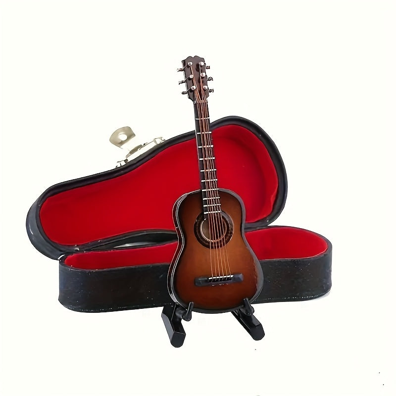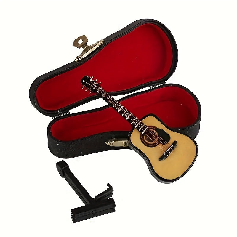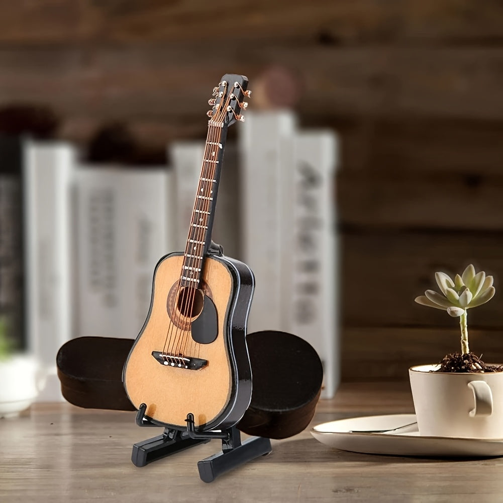 גיטרה מיניאטורית מעץ — עם מעמד וקופסה — פריט נוי שמנגן על הנוסטלגיה