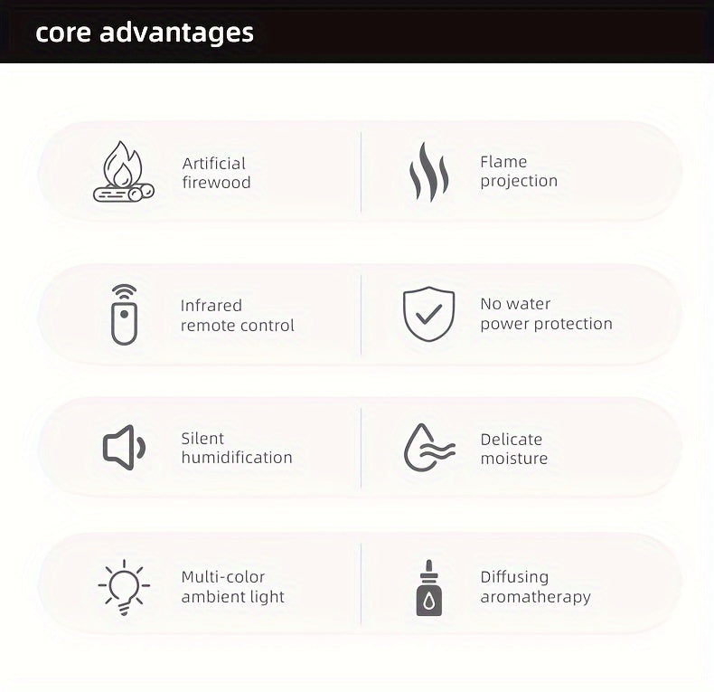 אדי מים קרים עם תאורת LED יוצרים אפקט להבה מרהיב שמרגיע את העין וממלא את החלל בניחוח עדין. שלט אחד קטן, שליטה מלאה מהספה. אידיאלי לסלון, חדר שינה ומשרד.