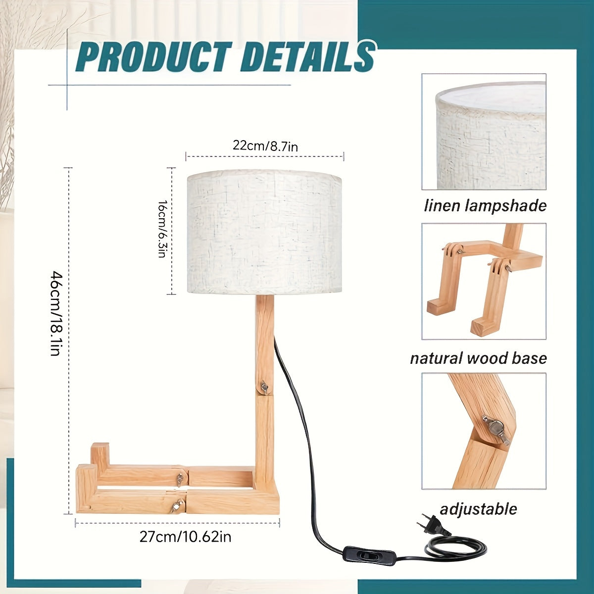 בסיס עץ טבעי, אהיל בד, מפסק בכבל