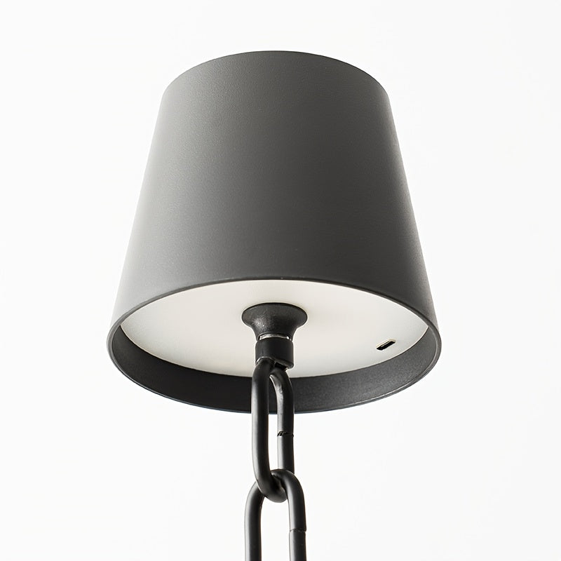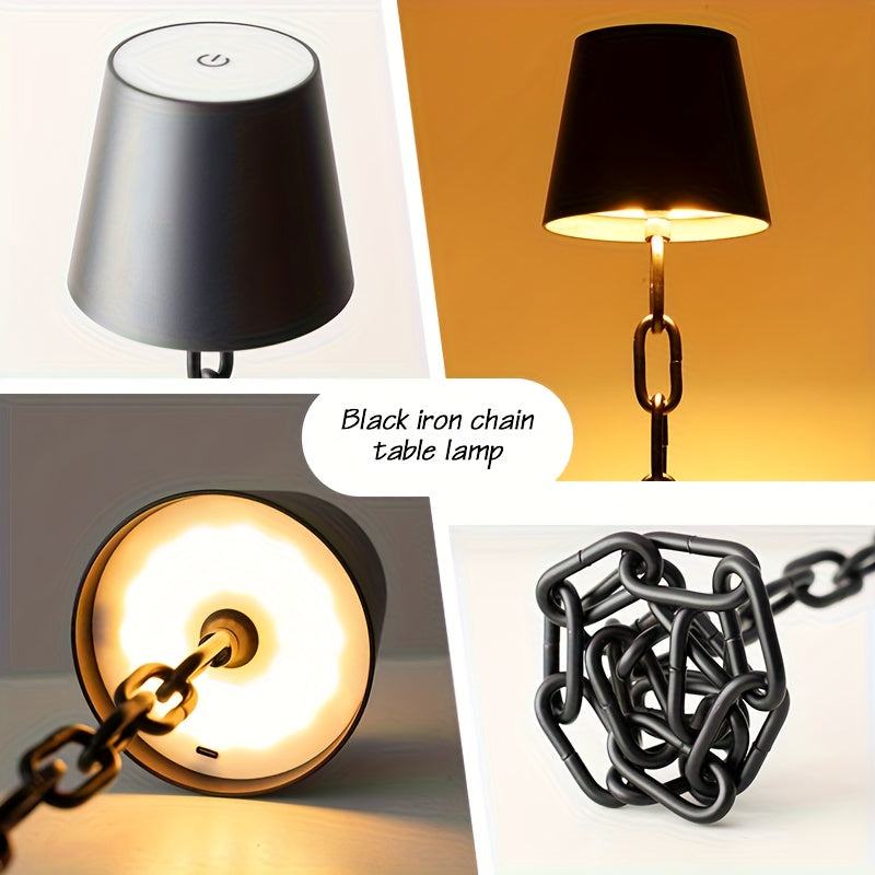 בסיס “שרשרת” בגימור שחור-מט, אהיל מינימליסטי ומגע עדין מלמעלה שמחליף גוון אור ומעמעם. עובדת בחיבור USB-C ונטענת – מושלמת לשידת לילה, סלון, משרד או דירת Airbnb.