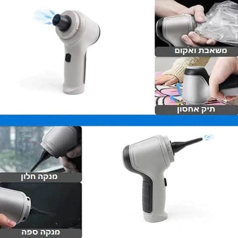 - ✓ מגיע לכל פינה — כולל נחירים דקים שמנקים מקלדת, מזגן, מחשב, חלונות ורכב.